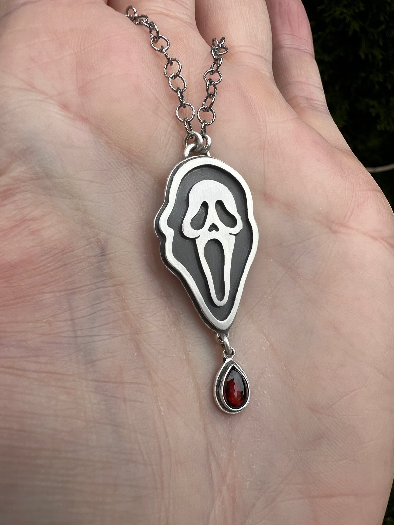 Double layered sterling silver. Handcut intricately detailed Ghost face inspired by the iconic horror classic SCREAM. Accented with a natural blood drip garnet. 2” x 1”. 18” sterling silver chain